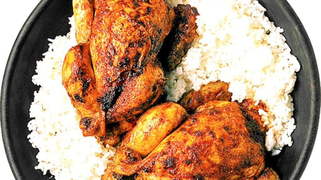 3. Broilerit ovat kypsiä, kun lisän sisälämpötila on 70-75 astetta. Pistä koetikku lihan paksuimpaan kohtaan ja tarkista, että siitä valuva neste on kirkasta ja läpinäkyvää. Puolita broilerit ja tarjoile keitetyn riisin kera.