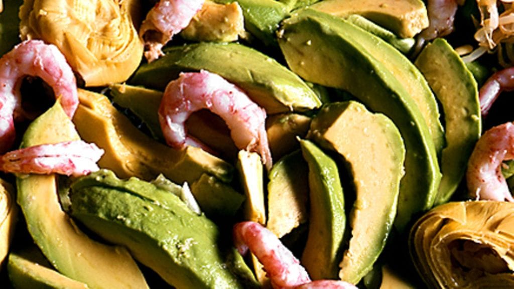 2. Halkaise avokadot ja poista kivet. Pirskota päälle hieman sitruunamehua niin ne eivät tummu. Asettele avokadonpalat keskelle salaattivatia. Asettele salaatinlehtiä, valutettuja latva-artisokansydämiä, kuorittuja katkarapuja ja pavunituja vadille.