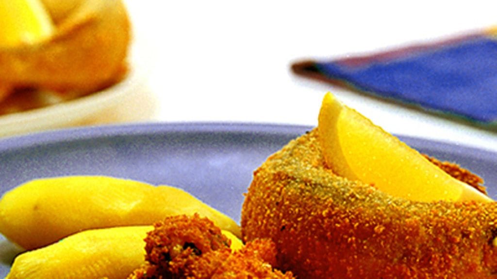 2. Perkaa valkoturskat, mutta pidä muuten kokonaisina. Kiinnitä tukevalla cocktailtikulla jokaisen turskan pyrstö sen kitaan, niin että kala muodostaa renkaan. Mausta kalat suolalla ja pippurilla ja kääntele ne ensin vatkatussa munassa, sitten korppujauhossa.