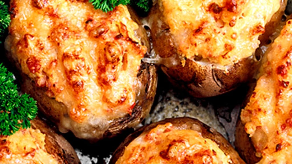 4. Täytä perunat, ripottele päälle juustoa ja gratinoi uunissa kunnes juusto on sulanut.