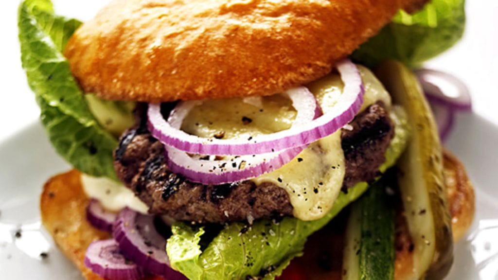 3. Viipaloi kurkut, jaa kurkut pitkittäin neljään osaan, kuori ja viipaloi punasipuli ohuelti. Huuhtele ja puolita salaatinlehdet. Grillaa pekonisiivuja minuutti kummaltakin puolelta. Halkaise ciabattasämpylät ja lämmitä ne grilliritilällä. Lado sämpylöille pihvit, kastike, vihannekset ja pekoni, nosta kansi jokaisen päälle ja tarjoile.