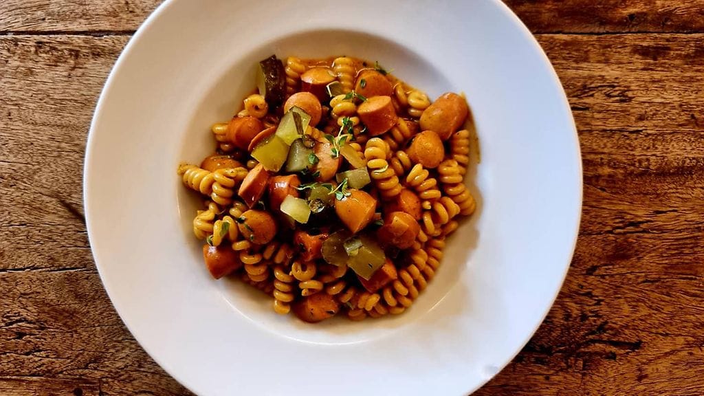 - Kaada kasariin oliiviöljyä ja lisää sipuli ja nakit. Lisää tomaattipyree, paprikajauhe sekä valkosipuli.