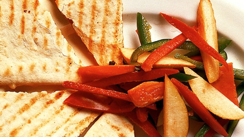 2. Sekoita keskenään juusto, hedelmät, paprika ja tacokastike. Pane tortillalevyjen toiselle puoliskolle täytettä, taita ja paina yhteen.