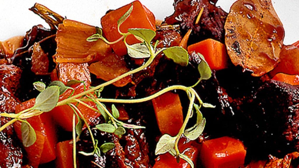 1. Kuori ja kuutioi sipulit ja porkkanat karkeasti. Paloittele liha isoiksi kuutioiksi. Ruskista voi suuressa paistinpannussa ja paista lihat niin että ne saavat hyvän paistopinnan. Mausta suolalla ja pippurilla. Lisää sipulit ja porkkanat pannuun ja anna niidenkin ruskistua. Puuteroi päälle vehnäjauhoja, sekoittele ja paista vielä muutama minuutti.