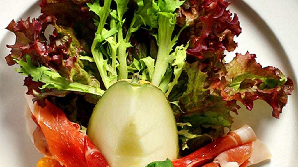 3. Asettele kinkkusiivut hedelmille, koristele basilikalehdillä.