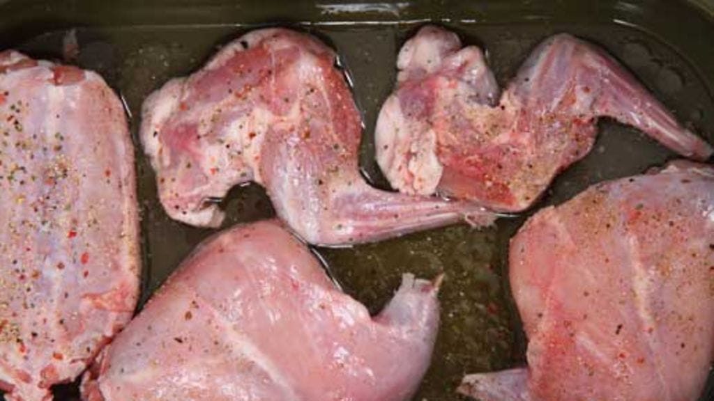 Puhdista ja sido jänis ja kääri pintaan pekonia. Ruskista kuumalla pannulla öljyssä, jossa mausteena rosmariini ja salvia. Pirskottele lihan päälle balsamiviinietikkaa ja murusta liemikuutio pannuun.