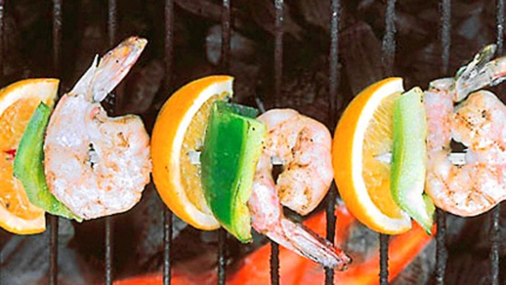 2. Pujota jättikatkarapuja, paprikaa ja appelsiinia vartaille, penslaa öljyllä ja kääntele kuuman hiilloksen päällä n. 5 minuuttia. Tarjoile keitetyn riisin kera.