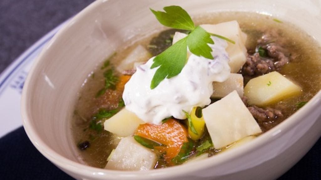 Ruskista isossa kattilassa jauheliha. Lisää joukkoon paloitellut vihannekset ja mausteet. Lisää lihaliemi ja sen verran vettä, että ainekset peittyvät ja keitä keskilämmöllä 15-25 minuuttia tai kunnes vihannekset ovat kypsyneet. Mausta suolalla ja pippurilla.
