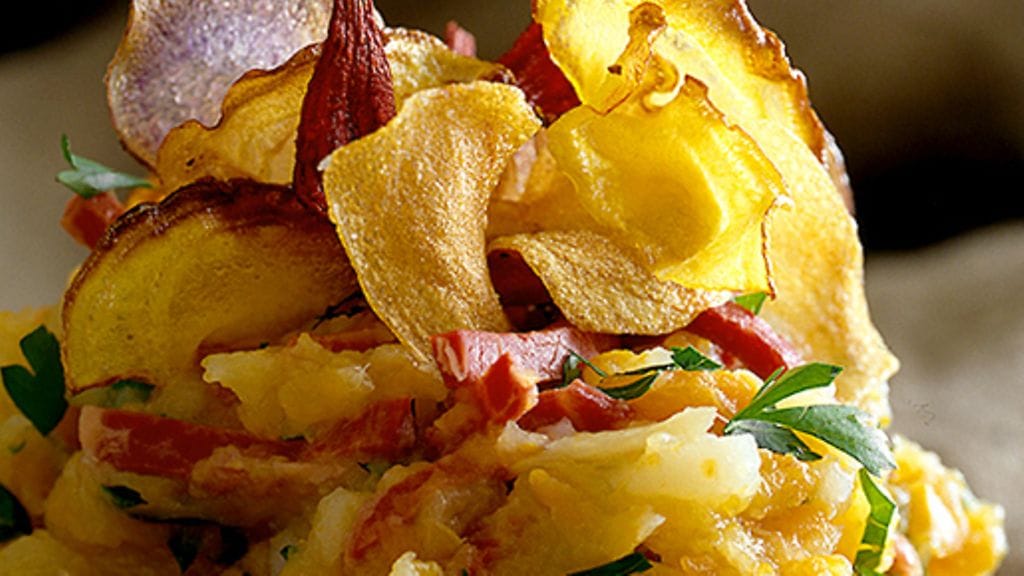 2. Pese ja kuori juurekset ja leikkaa kaikki pienemmiksi paloiksi. Kuumenna lihankeitinliemi kiehuvaksi. Laita lantut kiehumaan ensin ja porkkanat ja perunat vasta hieman myöhemmin. Keitä juurekset pehmeiksi, noin 20 minuuttia. Nosta juurekset keitinliemestä ja varo ottamasta mukaan persiljanvarsia, pippureita tai laakerinlehteä. Soseuta puolet juureksista ja kaada joukkoon hieman keitinlientä ja nokare voita. Mausta suolalla ja pippurilla. Sekoita soseeseen loput juurekset, niin että saat muusia, jossa on kunnon paloja seassa.
