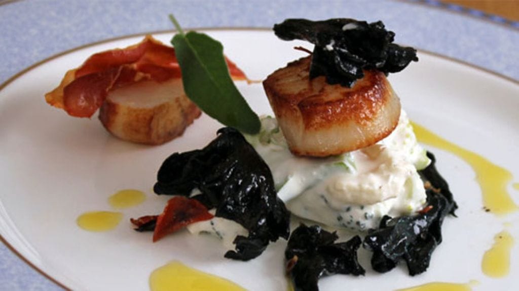 1. Lämmitä hieman öljyä pannulla. Kun pannu on mahdollisimman kuuma, aseta kampasimpukat pannulle. Paista noin 1 minuutti molemmilta puolilta. Kampasimpukka saa jäädä hieman raa’aksi, sillä kampasimpukka kypsyy vielä noin minuutin verran paistamisen jälkeen.