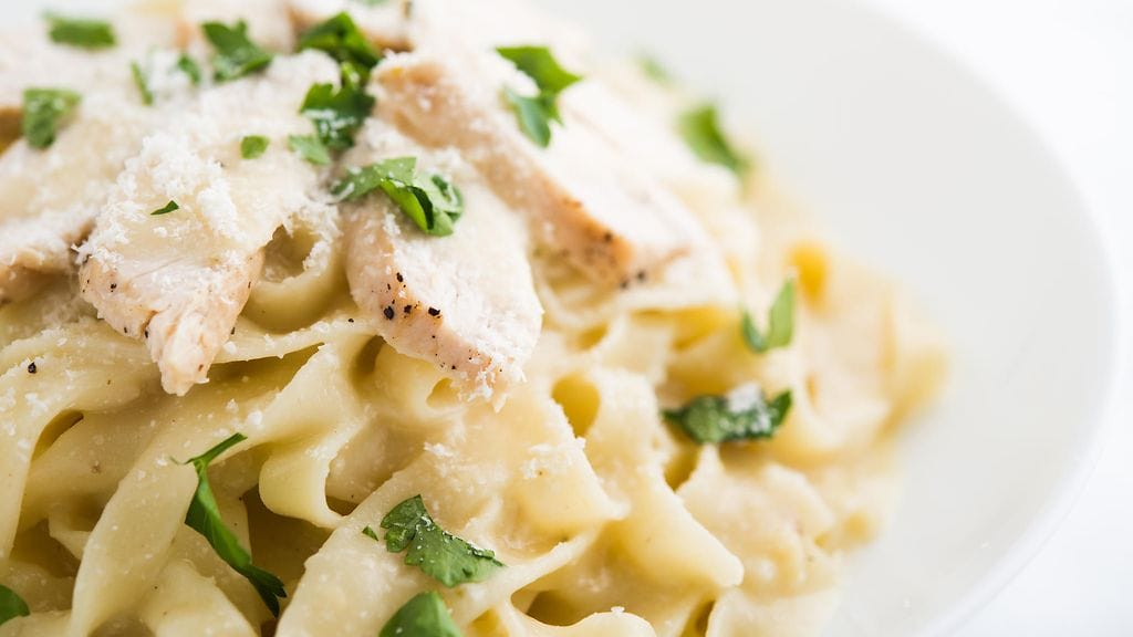 - Kuumenna pannulla täysmaito, kanaliemi ja hienonnettu valkosipuli. Maista tarvittaessa suolalla ja pippurilla. Lisää fettuccine-pasta ja keitä al dente -kypsyyteen.