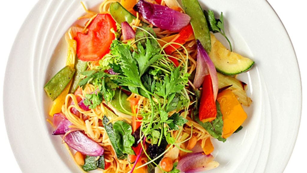 2. Keitä nuudelit pakkauksen ohjeen mukaan. Suikaloi paprikat, punasipulit ja purjon puolikas. Leikkaa kesäkurpitsan puolikas ja porkkanat ohuiksi viipaleiksi. Wokkaa kasvikset aloittamalla niistä, jotka kypsyvät hitaimmin. Lisää munanuudelit kasvisten joukkoon ja sekoita huolellisesti.