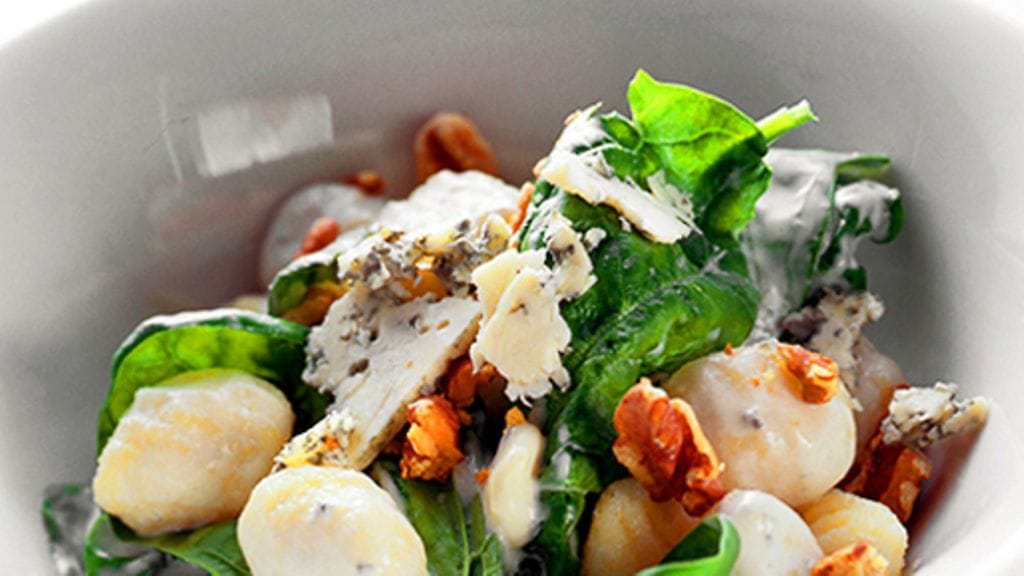 3. Perkaa pinaatti, murenna sinihomejuusto ja rouhi saksanpähkinät karkeasti. Kerrostele tarjoiluvadille tai annoslautasille haukiquenelleja vuorotellen pinaatin ja homejuustomurujen kanssa. Lusikoi kermaa annosten päälle ja ripota viimeksi pähkinöitä pinnalle.