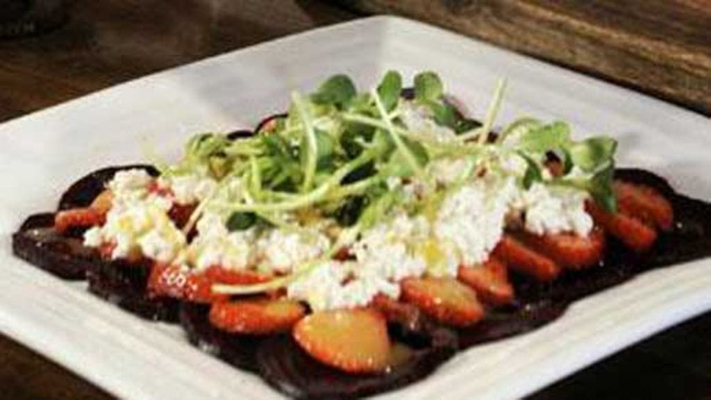 Asettele punajuuren siivut lautaselle, ja seuraavaksi lisää mansikkasiivut. Lorauta hieman oliiviöljyä siivujen päälle. Murenna fetajuustoa salaatin päälle. Koristele salaatti auringonkukan iduilla ja mustapippurilla.