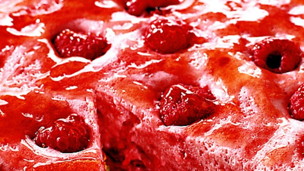 3. Kaada vadelma-valkuais-kermaseos vuokaan ja lusikoi päälle sulanutta viinimarjahyytelöä. Painele päälle vadelmia koristeeksi ja pane torttu pariksi tunniksi jääkaappiin.