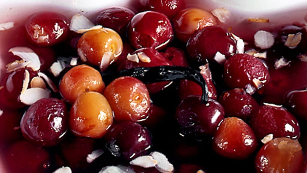 1. Poista kirsikoista kivet. Keitä ne hiljalleen pehmeiksi veden, sokerin, kanelin ja vaniljatangon (halkaistuna pituussuuntaan) kanssa.