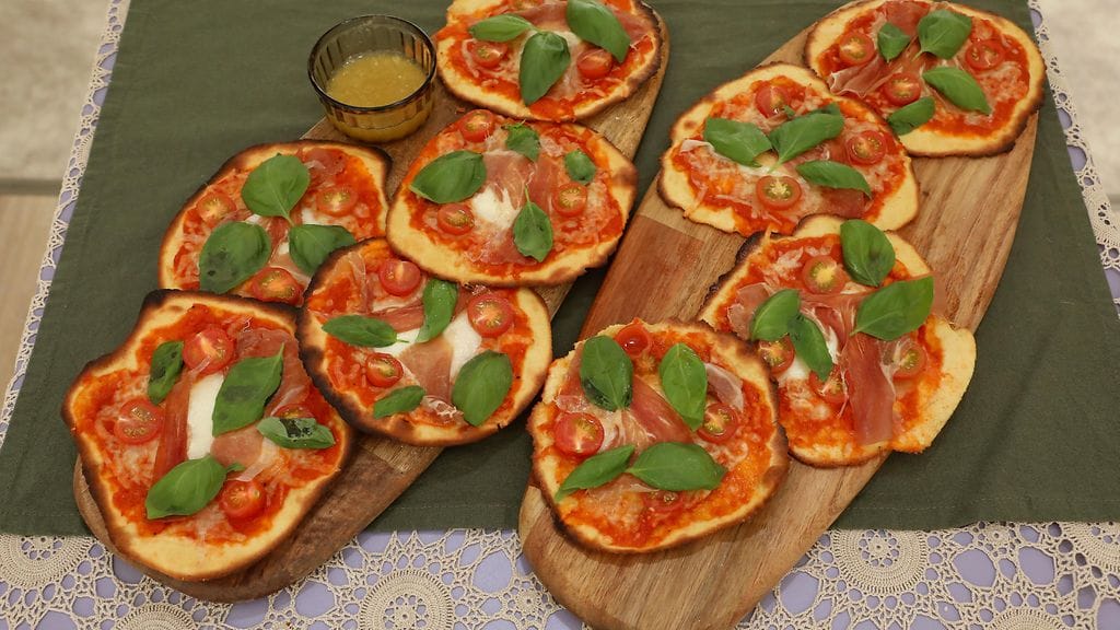 PIZZAPOHJA: Sekoita kuivat aineet keskenään, tee niiden keskelle kolo, jonne kaadat lämpimän veden ja öljyn. Vaivaa tasaiseksi ja kimmoisaksi taikinaksi, niin kauan ettei taikina enää ime jauhoa itseensä. Jätä liinan alle lämpimään nousemaan noin 15 minuutiksi. Tee sillä välin tomaattikastike.