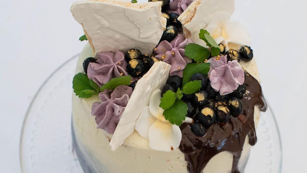 KAKUN KOKOAMINEN JA KORISTELU: Aloita täytekakun kokoaminen kostuttamalla ensimmäinen pohja sitruunakivennäisvedellä. Valele kakkupohjan päälle ohut kerros lemon curdia. Nostele pohjan päälle 1/3 osa mustikkamoussesta pinta tasoittaen ja lisää rouhittuja manteleita. Toista tämä vielä kerran ja aseta viimeinen kakkupohja kanneksi. Vatkaa kananmunan valkuaiset pehmeäksi vaahdoksi kuuman vesihauteen yllä. Lisää joukkoon erikoishieno sokeri pieninä määrinä kerralla. Jatka vatkaamista kuuman vesihauteen yllä. Kun kreemi on paksuuntunut ja se muodostaa huippuja, jatka vatkaamista pöydällä ilman vesihaudetta. Kun kreemi on jäähtynyt, vatkaa joukkoon huoneenlämpöinen voi pieninä erinä. Kreemin keltaisuutta voi taittaa sekoittamalla pieni määrä violettia pastaväriä joukkoon. Ota kreemistä 1/3 erilliseen kulhoon ja jaa tämä vielä tasan kolmeen eri osaan, jokainen omaan kulhoonsa. Lisää jokaiseen kulhoon violettia ja sinistä pastaväriä eri suhteissa, jolloin syntyy kolme erilaista sävyä. Kuorruta täytetty kakku kevyesti valkoisella marenkivoikreemillä ja laita se kovettumaan jääkaappiin noin 15 minuutiksi. Kuorruta kakku kauttaaltaan valkoiseksi. Liukuvärjäys: vedä kakun reunaa myöten liukuvärjäys erisävyisillä kreemeillä. Tässä vaiheessa saa käyttää omaa luovuuttaan ja leikkiä erilaisten sävyjen kanssa. Vedä reunus lopuksi tasaiseksi. Koveta kuorrute jääkaapissa noin 15 minuuttia, jotta se on tarpeeksi jähmeä ennen valkosuklaaganachen laittamista.