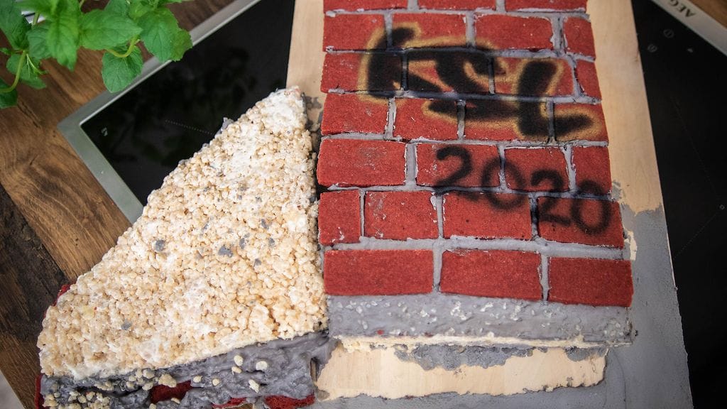 "Muutto Helsingin Sörnäisiin inspiroi minua urbaaniudellaan. Tästä kehittyikin siis kekseistä tehty tiiliseinä, jonka pinnassa graffiti. Varsinainen seinä on tehty riisimuroista, joka on sitten vuorattu sitruunakekseillä. Laasti koostuu pikeeristä, jonka avulla muutkin osat liimataan yhteen."