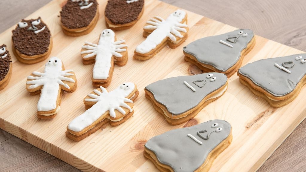 KEKSIT: Uuni lämpiämään 180 °C. Kauli taikina n. 4 mm ohueksi. Leikkaa sabluunan avulla hahmot taikinasta. Tee jokaista muotoa tuplamäärä (pohja + päällinen) eli 8 kpl jokaista muotoa. Paista uunissa 180 °C, noin. 6–7 min / pelti. Jäähdytä keksejä jääkaapissa ennen pikeerin laittamista.