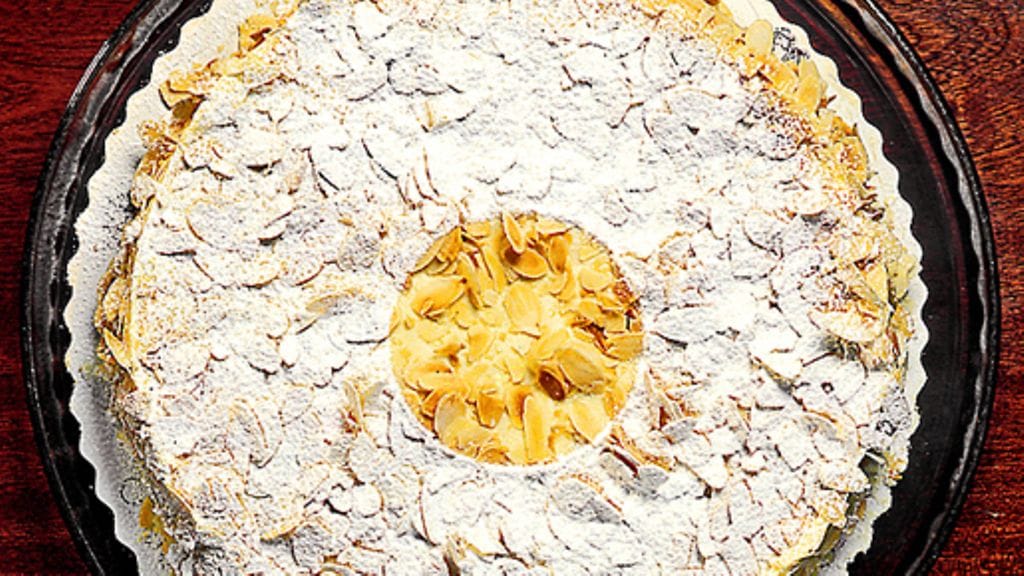 1. Torttupohjat: Kuumenna uuni 125 asteeseen. Piirrä isolle leivinpaperiarkille neljä pyöreää torttupohjaa. Voitele paperi hyvin voilla tai öljyllä. Kalttaa, kuori ja jauha mantelit. Sekoita ne tomusokerin kanssa. Vatkaa munanvalkuaiset kiiltäväksi, mutta ei kovaksi. Sekoita valkuaiset manteli-sokeriseokseen. Levitä seos piirretyille pohjille. Jos haluat niistä hieman paksumpia, kolmekin pohjaa riittää. Paista pohjia uunin keskitasolla 10-15 minuuttia. Anna niiden jäähtyä hieman ennen kuin varovaisesti irrotat ne paperista.