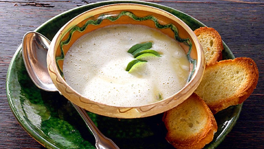 3. Soseuta keitto ja kaada takaisin kattilaan. Sekoita joukkoon kerma ja mausta suolalla ja pippurilla. Juuri hetkeä ennen tarjoilua keitto vielä kiehautetaan ja sekaan kaadetaan kuohuviini. Tarjoile lämmitetyiltä lautasilta, koristele mintunlehdillä ja krutongeilla.