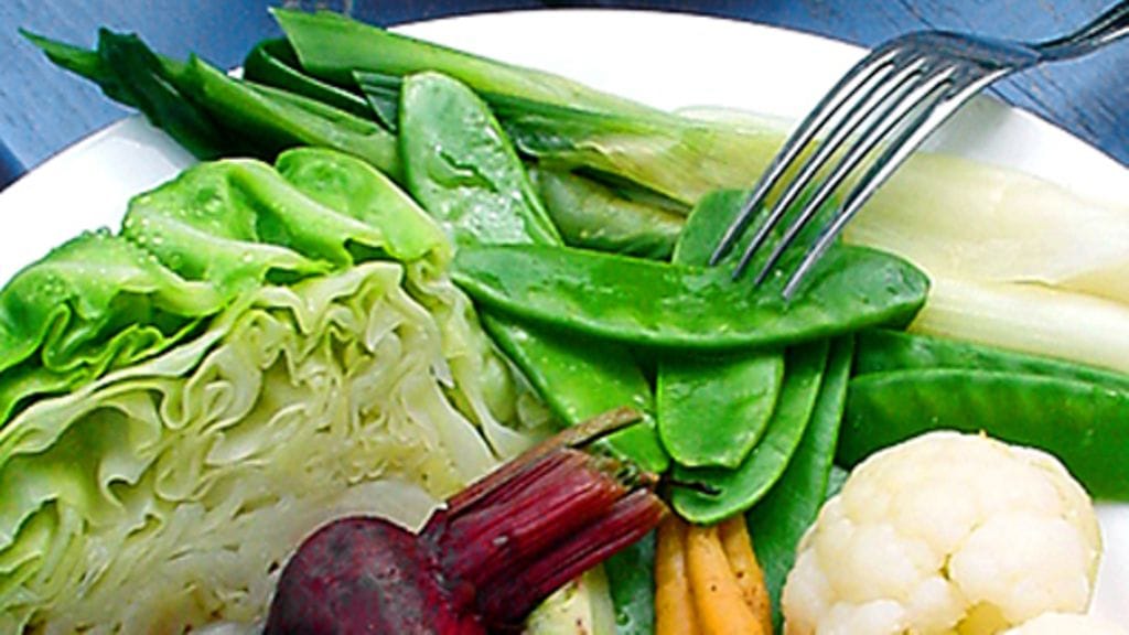 2. Pese ja siisti vihannekset. Keitä iso kattilallinen vettä, suolaa ei tarvita. Laita vihannekset kiehumaan kypsymisjärjestyksessä. Esim. ensin kokonainen kukkakaali ja kaalirapiviipaleet, sitten pikkuporkkanat jne. ja viimeiseksi sokeriherneet, jotka tarvitsevat vain hetken. Voit keittää siis kaikki vihannekset samassa kattilassa, lukuun ottamatta punajuuria, jotka värjäävät kaiken muun vaaleanpunaiseksi. Varo keittämästä vihanneksia ylikypsiksi ja liian pehmeiksi. Maukkaimmillaan ne ovat nipinnapin kypsinä, vielä hieman rapeina.