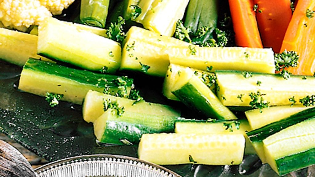 2. Perkaa ja puhdista vihannekset. Jaa kukkakaalit pienemmiksi kukinnoiksi, leikkaa purjo ja kurkku palasiksi ja porkkanat viipaleiksi.