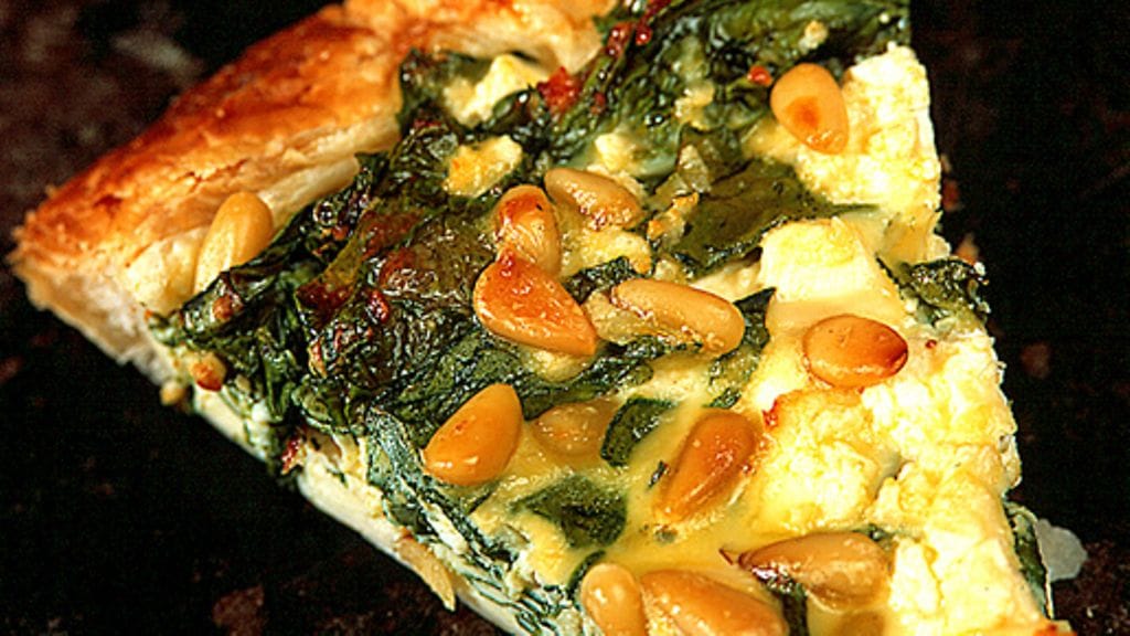 3. Vuoraa piirasvuoka voitaikinalla, leikkaa reunat kauniiksi. Kaada täyte piirasvuokaan, ripottele päälle pinjansiemenet ja paista 30 minuuttia tai kunnes täyte on jähmettynyt ja reunat ovat kauniin kullanruskeat ja rapeat.