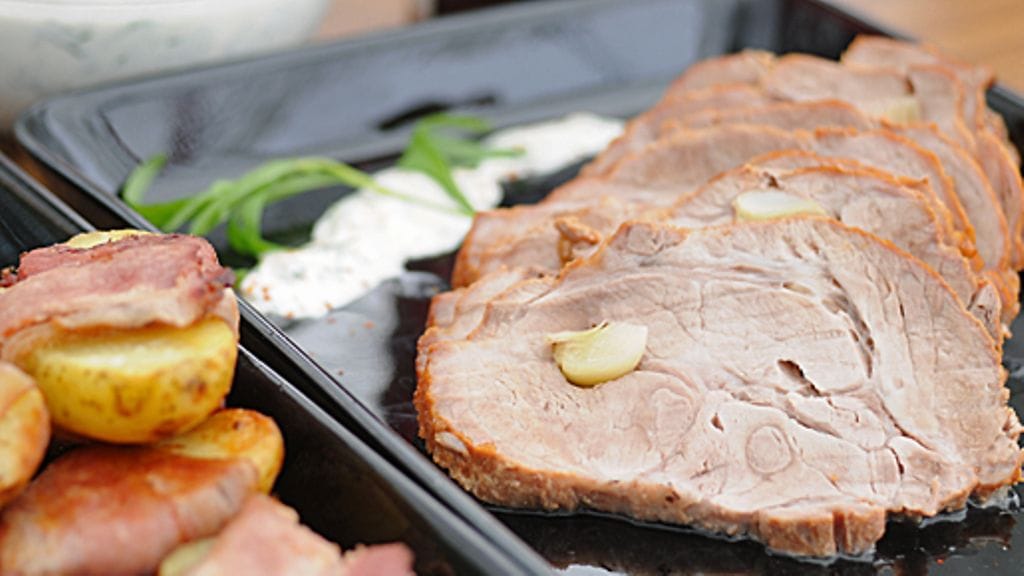 Pistele lihaan reikiä ja tunge niihin valkosipulinlohkoja. Suolaa lihan pinta ja mausta se ananas-grillauskastikkeella ja sinapilla. Anna maustua tunnista useaan ja savusta sähkösavustimella kunnes lihan sisälämpö on 75 astetta. Jätä liha vetäytymään vielä muutamaksi minuutiksi ja leikkaa se puolen sentin viipaleiksi. Tarjoa pekoniperunoiden ja yrttikastikkeen kera.
