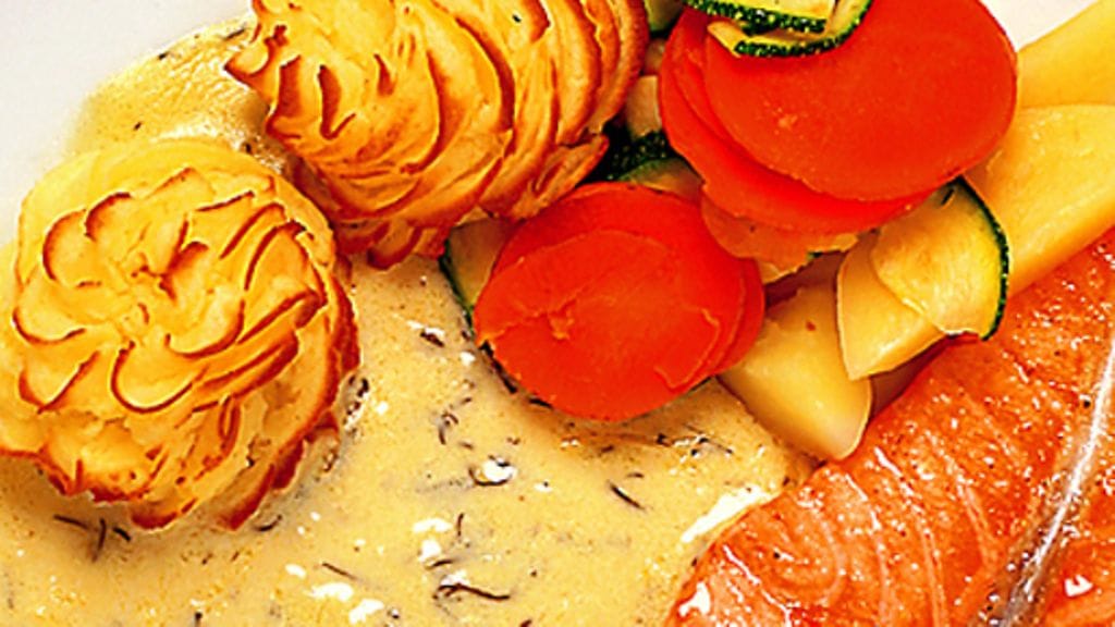 3. Pommes duchesse: Kuori ja keitä perunat hyvin ja anna höyryn haihtua. Muussaa perunat ja lisää keltuaiset, öljy ja mausteet. Sekoita hyvin. Pursota duchesse uuninkestävään vuokaan ja gratinoi 200-asteisessa uunissa 15 minuuttia.