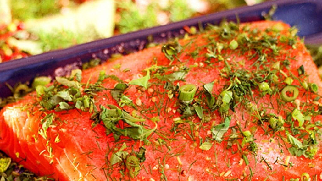 Vinkki: Kokeile myös kypsyttää lohi muiden tuoreiden mausteyrttien päällä. Silppua viherpediksi esim. sitruunatimjamia, salviaa, oreganoa ja rosmariinia.
