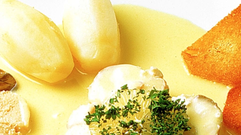 3. Sekoita voi ja jauhot suurukseksi. Lisää se nokareittain liemeen samalla sekoittaen, kunnes kastike on halutun paksuista. Lisää kerma ja keitä 4-5 minuuttia. Mausta sitruunamehulla, suolalla ja pippurilla.
