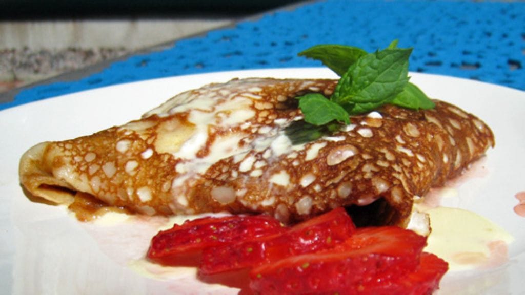 Tarjoa vaniljakastikkeen ja mansikkasiirapin kanssa.