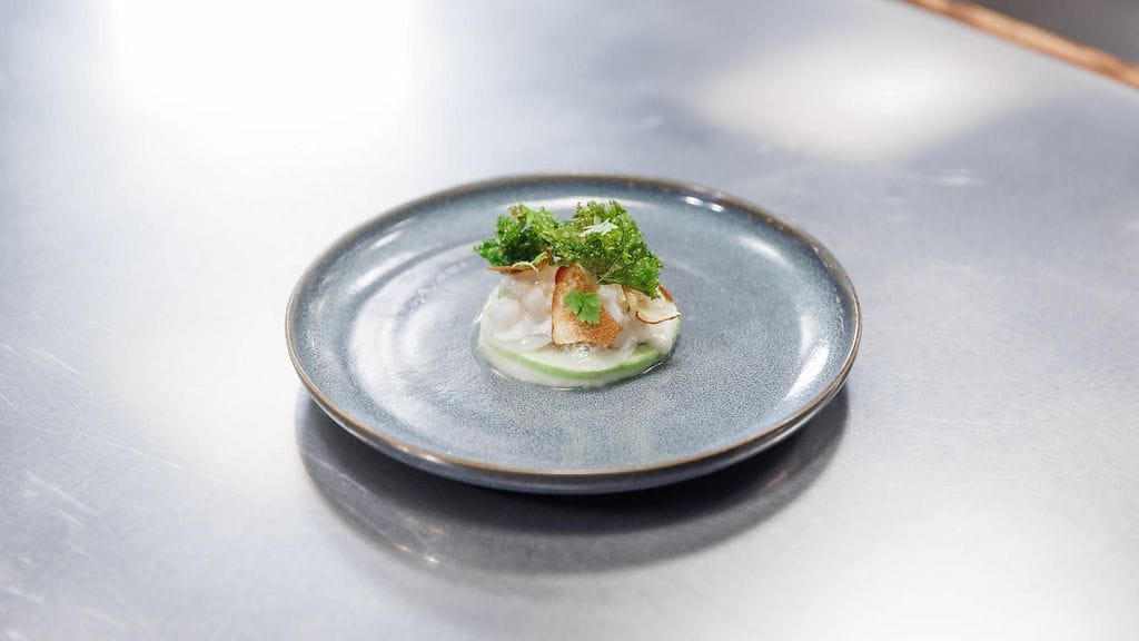 Pilko sipuli ja valkosipuli hernepyreetä varten ja kuullota niitä voissa. Kiehauta sekaan valkoviini ja lisää kerma. Keitä sipulit pehmeiksi ja lisää herneet, jonka jälkeen nopea lämmitys ja ajo sileäksi tehosekoittimessa voin kanssa. Mausta suolalla ja lisää agar agar. Kiehauta ja laita hyytymään. Kun pyree on hyytynyt stanssaa kiekkoja ja nosta lautaselle.