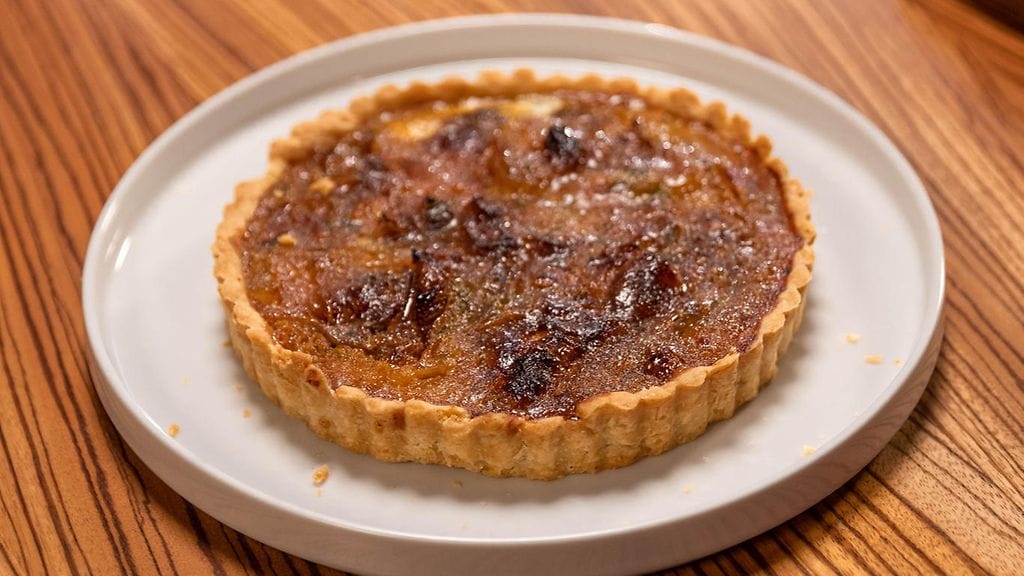Laita paistetut sipulit piirakkapohjalle. Sekoita 3 keltuaista, sipuleiden paistosiirappi ja tuoretta timjamia kastikkeeksi ja kaada piirakan päälle.