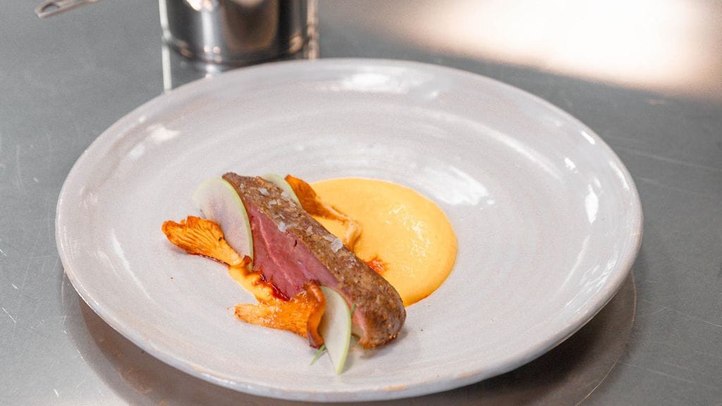Valmista omena-bataattipyre. Aloita kuumentamalla kattilassa täysmaito. Kuutio bataatit joukkoon ja kypsennä. Lisää joukkoon yksi valkosipulin kynsi. Lisää loppuvaiheessa kuutioitua granny smith omenaa. Mausta suolalla ja pippurilla. Kun bataatti sekä omena on kypsää niin kaada seos tehosekoittimeen ja blendaa tasaiseksi massaksi. Lisää joukkoon täysmaitoa. Maista ja mausta tarvittaessa.