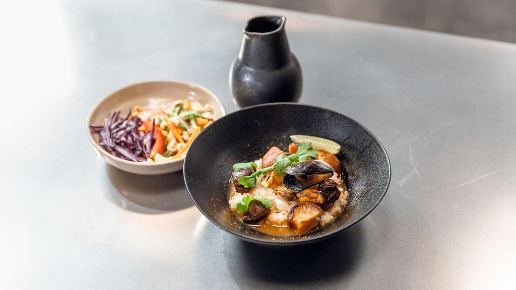 Huuhdo riisiä niin kauan, että vesi on kirkasta. Laita riisi kattilaan ja lisää vettä niin, että sitä on riisin yli pikkusormen ensimmäiseen niveleen asti ja laita kiehumaan. Laita kattilaan ½ litraa kanalientä ja lisää rouheaksi pilkotut inkiväärit, chilit ja lime. Anna makujen kiehua kokoon ainakin 15 min.
