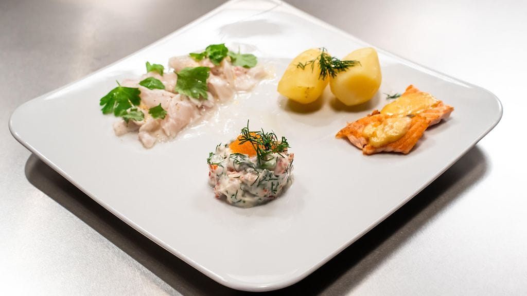 Valmista skagenröra. Hienonna sipuli ja tilli. Sekoita kaikki raaka-aineet keskenään. Mausta suolalla.