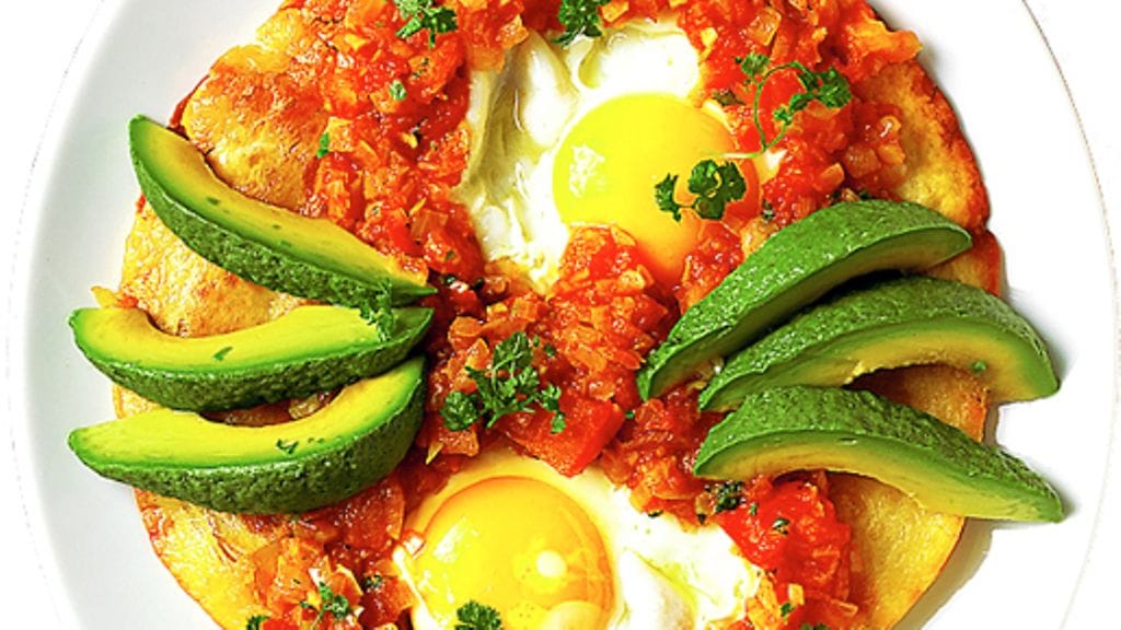 3. Aseta kaksi tortillaa kullekin lautaselle ja sijoita munat päälle. Juoksuta sitten kastikenauha jokaisen kananmunan ympärille. Koristele avokadoviipaleilla.
