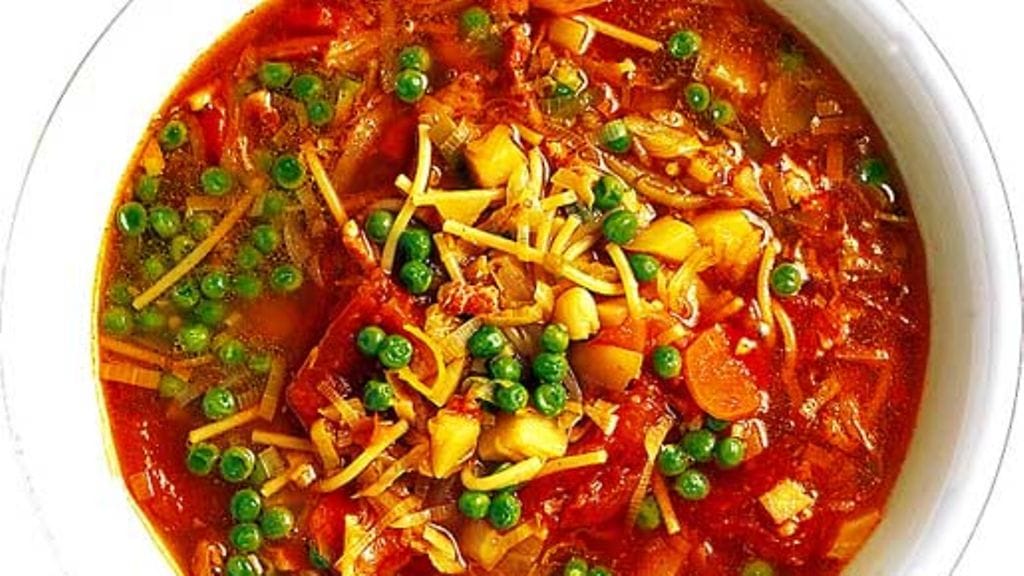 1. Huuhtele, kuori ja puhdista sipuli, purjo, porkkana, perunat ja kaali. Leikkaa kasvikset ohuiksi viipaleiksi tai suikaleiksi. Kuutioi perunat ja suikaloi siankylki. Kalttaa ja kuori tomaatit ja leikkaa lohkoiksi. Paista lihasuikaleita keittopadassa, älä ruskista. Lisää sipulit ja kuullota hetki. Lisää porkkana, purjot (säästä vihreä osa), perunat ja kaali. Kuullota vihanneksia kannen alla, kunnes ne ovat kauniin värisiä. Ravista pataa välillä.