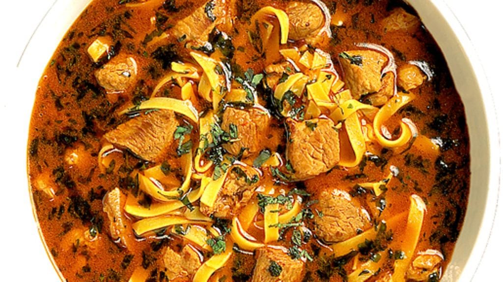 2. Lisää tomaattipyree, suola, paprikajauhe ja vesi. Kiehauta ja hauduta tunti. Lisää nuudelit ja keitä pehmeiksi.