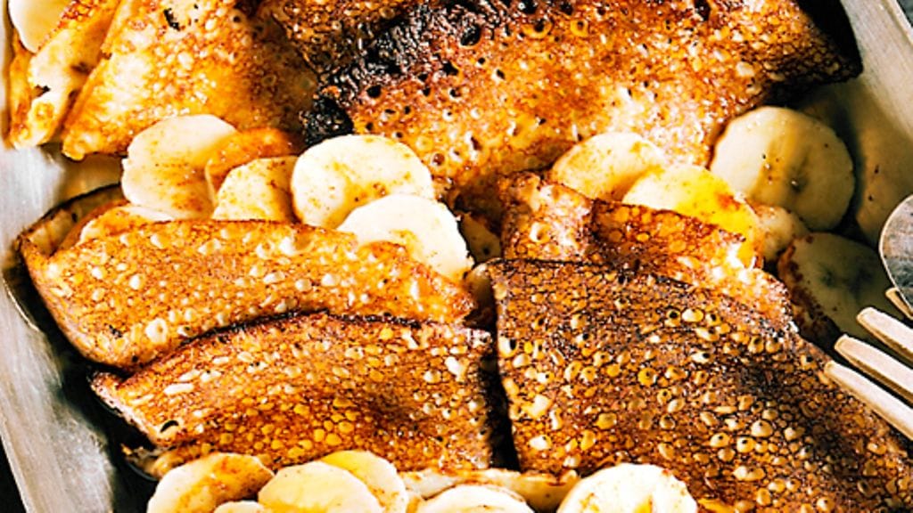 2. Sekoita kaneli banaaniviipaleisiin kulhossa. Taittele ohukaiset neljään osaan ja täytä ne banaanilla. Aseta uunivuokaan, valuta hunajaa ohuena nauhana lettupakettien päälle ja pane uuniin 2-3 minuutiksi.