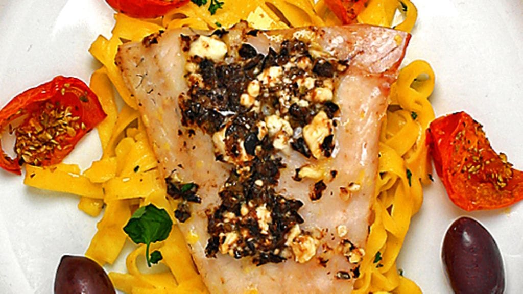 2. Nosta kuha voideltuun uuninkestävään vuokaan. Sekoita oliivit, kaprikset ja voi tahnaksi. Lisää fetajuusto. Levitä tahna kalan päälle. Kypsennä uunissa 15 minuuttia. Varmista, että kala on kauttaaltaan valkoista. Kypsennä tarvittaessa vielä hetki.