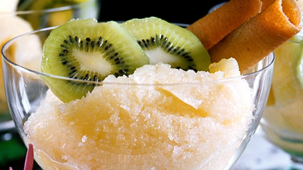 3. Ota sose pakastimesta muutaman kerran ja vatkaa ilmavaksi. Laita puoliksi jäätynyt massa laseihin, tarjoile kiivin ja vohvelien kera.