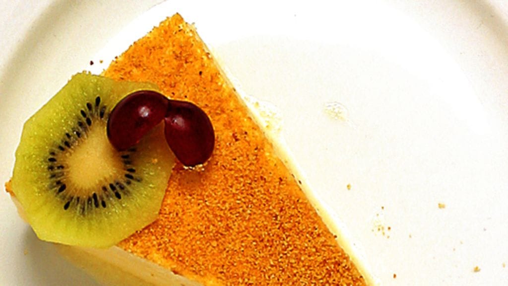 3. Hienonna keksit huhmareessa tai tehosekoittimessa. Ripottele keksinmurut kakun päälle ja jaa kakku annospaloiksi. Koristele hedelmillä.
