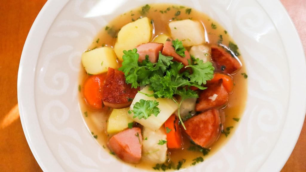 - Mausta laakerinlehdillä ja kokonaisilla mustapippureilla. Anna kiehua noin 10 min. Poista kuori makkarasta ja paloittele kuutioiksi. Paista pannulla, jotta makkara saa väriä ja lisää vasta sitten keittoon.