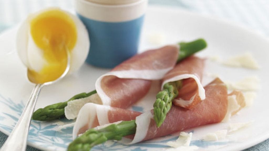 Keitä kanamunia noin 3 minuuttia, niin että keltuainen jää löysäksi ja aseta munakuppeihin. Levitä parmankinkun siivut leikkuulaudalle ja aseta päälle parsa ja parmesaania. Kääri kinkku parsatangon ympärille. Leikkaa munan päällysosa varovasti pois ja dippaa parsa-parmankinkkukääröjä munan keltuaiseen.