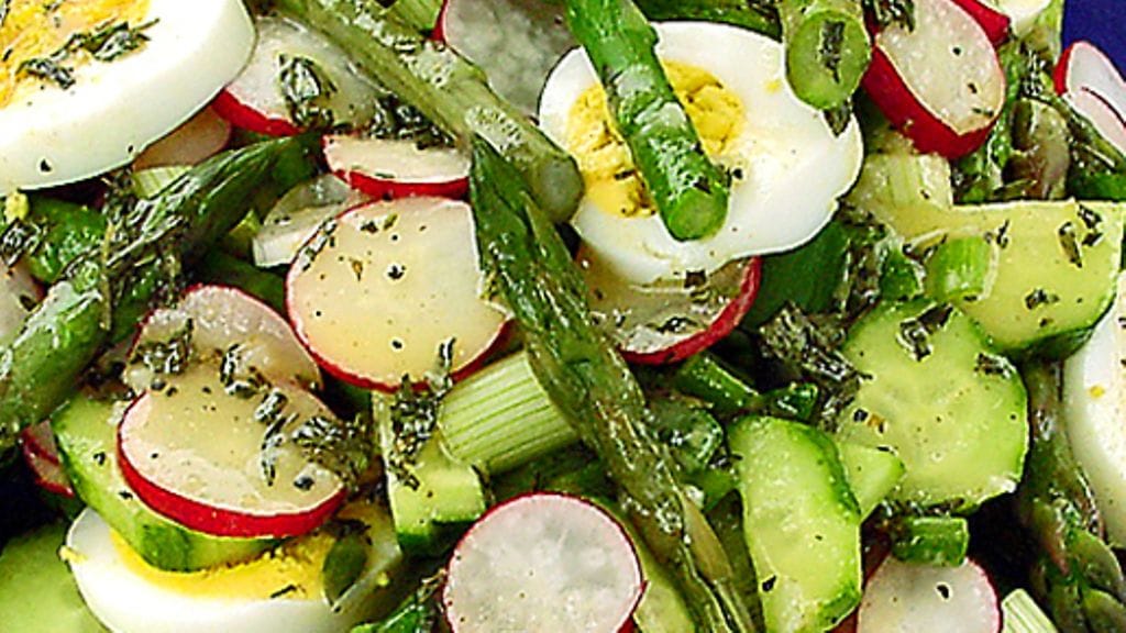 2. Puhdista kevätsipulit ja leikkaa suikaleiksi. Kuori kurkku osittain, niin että se tulee raidalliseksi, halkaise pitkittäin ja leikkaa puolikuusiivuiksi. Huuhdo retiisit ja poista juuret ja naatit, viipaloi.