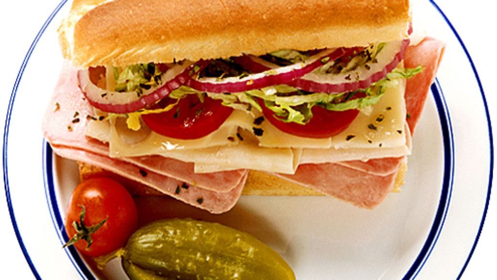 3. Halkaise patonki pituussuuntaan ja voitele puolikkaat margariinilla. Laita päälle kalkkunaa, kinkkua ja juustoa sekä tomaattia, salaattia ja punasipulia. Tiputtele päälle kastiketta, tarjoile tomaatin ja suolakurkun kera.